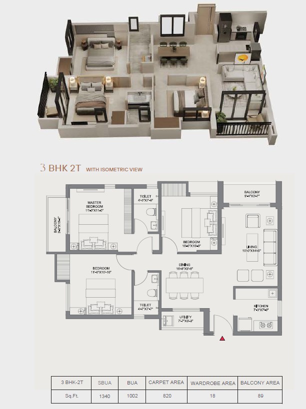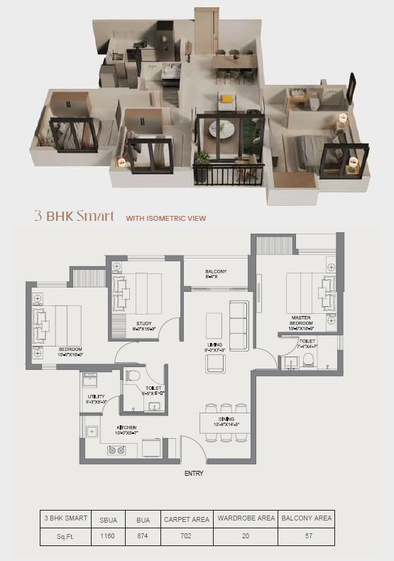 • 3 BHK 2T (Smart) 1160 sq.ft.